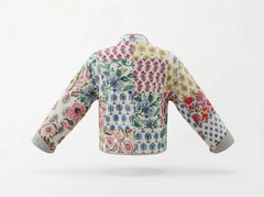 A celebration of color and craft, the Garden Mosaic Patchwork Quilted Jacket brings together an artful mix of floral prints in a beautifully balanced design. Featuring a patchwork of vibrant pinks, sunny yellows, rich blues, and fresh greens set against a soft ivory base, this jacket feels both playful and refined. Made from lightweight quilted cotton, it offers comfortable warmth with a breathable feel.