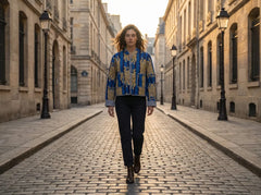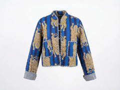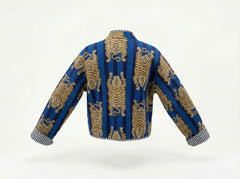 Bold and beautifully detailed, the Sapphire Stripe Tiger Quilted Jacket blends striking pattern with refined structure. Featuring majestic golden tiger motifs set against rich sapphire and deep navy vertical stripes, this jacket offers a dramatic yet polished look.